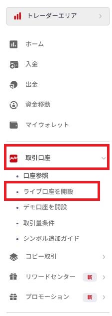 取引口座をクリックしていただき、【ライブ口座を開設】をクリックしてください。