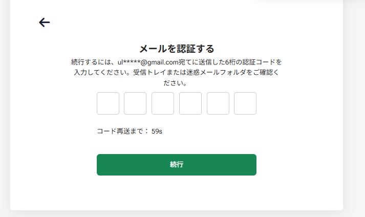 登録したメールアドレスに、6桁の認証コードが届きますので