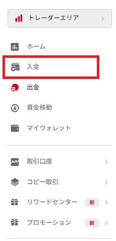 画面左のメニューから、【入金】をクリックしていただき