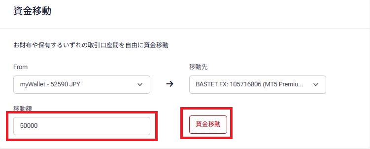 移動先には、先程開設していただきましたPremium口座を選んでいただき