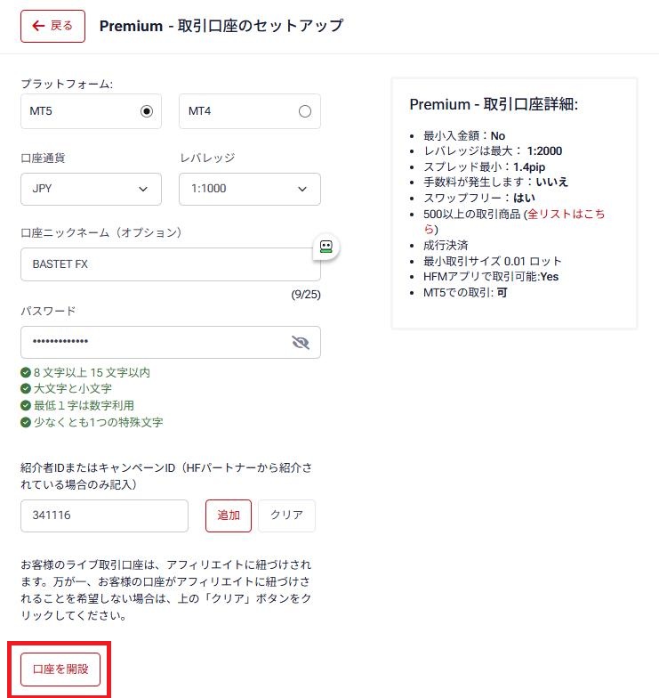 入力ができましたら、【口座を開設】をクリックしてください。